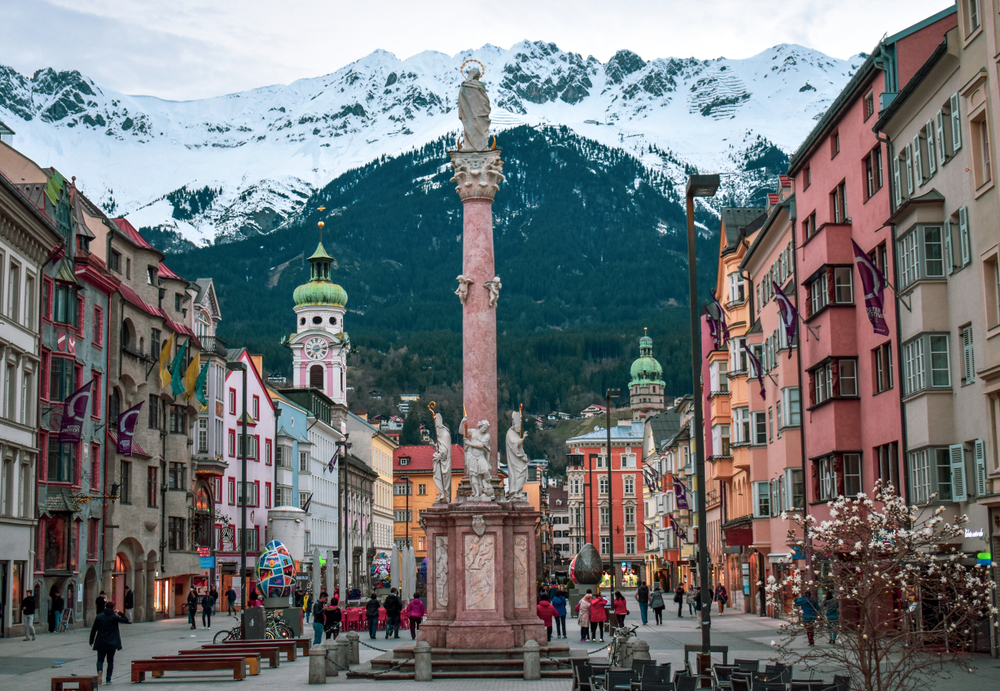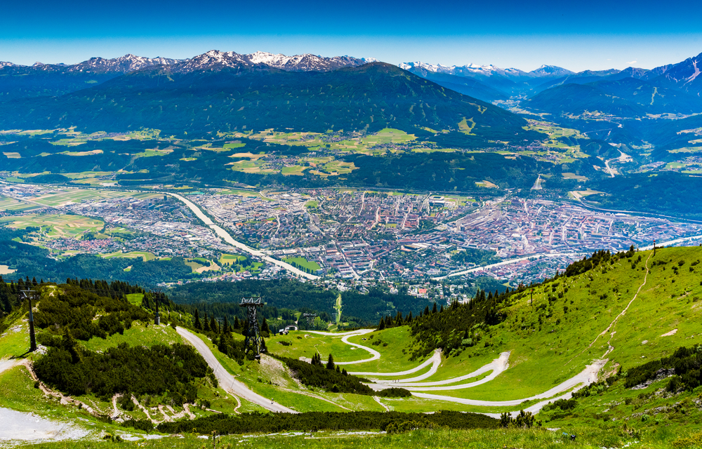 インスブルック 標高:約580m 古くからアルプスを横断する重要な交通路。15世紀末ハプスブルク家が居城を構えたことから街が大きく発展。現在も王家の栄華がいたるところに見られます。 ノルトケッテ連峰のハーフェレカー展望台(標高約2300m)に上れば、眼下にインスブルックの街、背後にパッチャーコーフェル山やイタリアとの国境ブレンナー峠まで見渡せます♪ 街からケーブルカーとロープウェイで簡単にアクセスできるのでお勧めです。 |